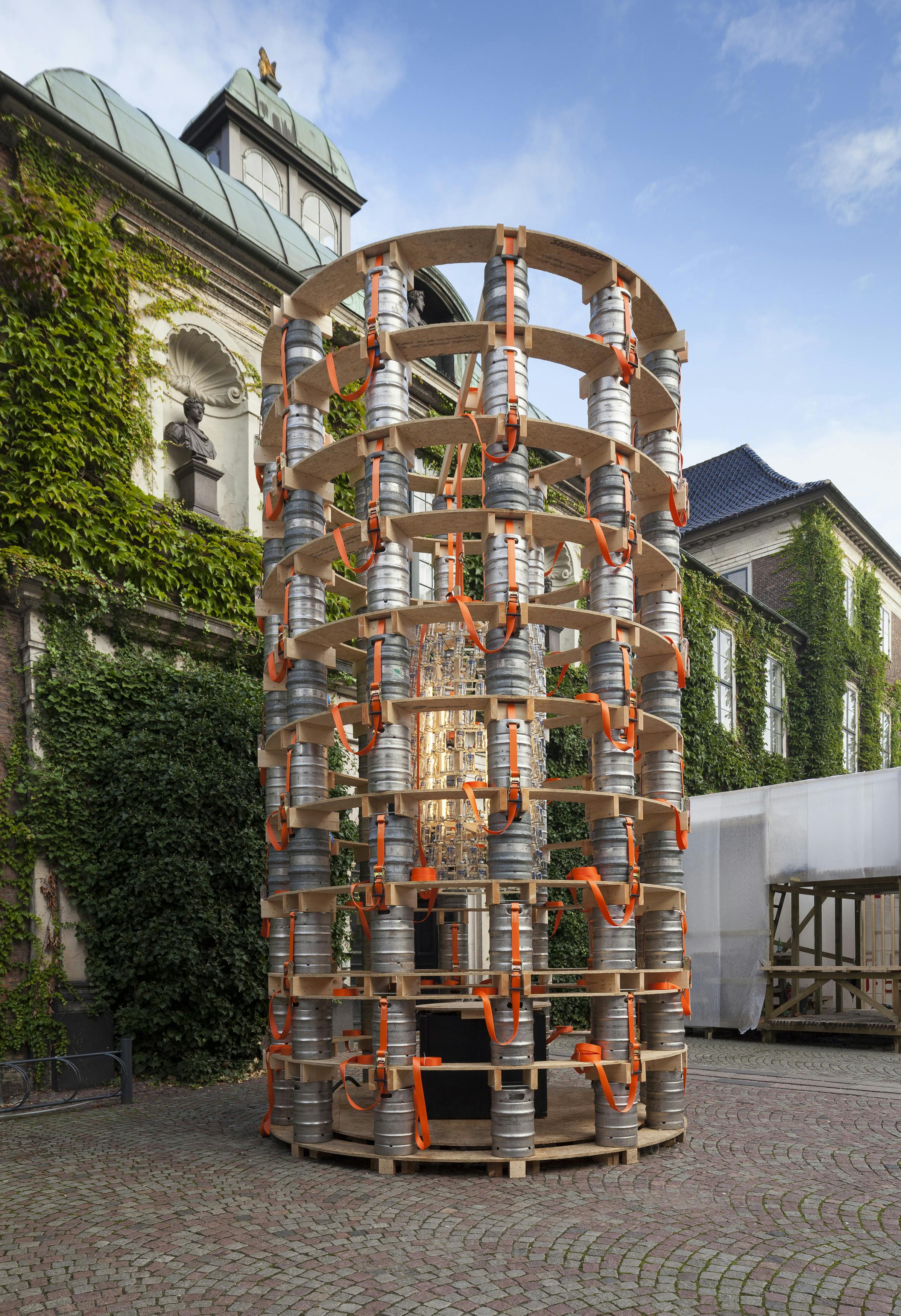 The project was a temporary pavilion and bar built for CHART Art Fair in Copenhagen in 2014. The main idea was to utilize the allready necessary components for the bar and the pavillion, thereby achieving an aesthetic using as few components as possible. Connections of wood and rings of osb-wood fasten the beer kegs and enabled the utilization of the kegs' strength in stacking.