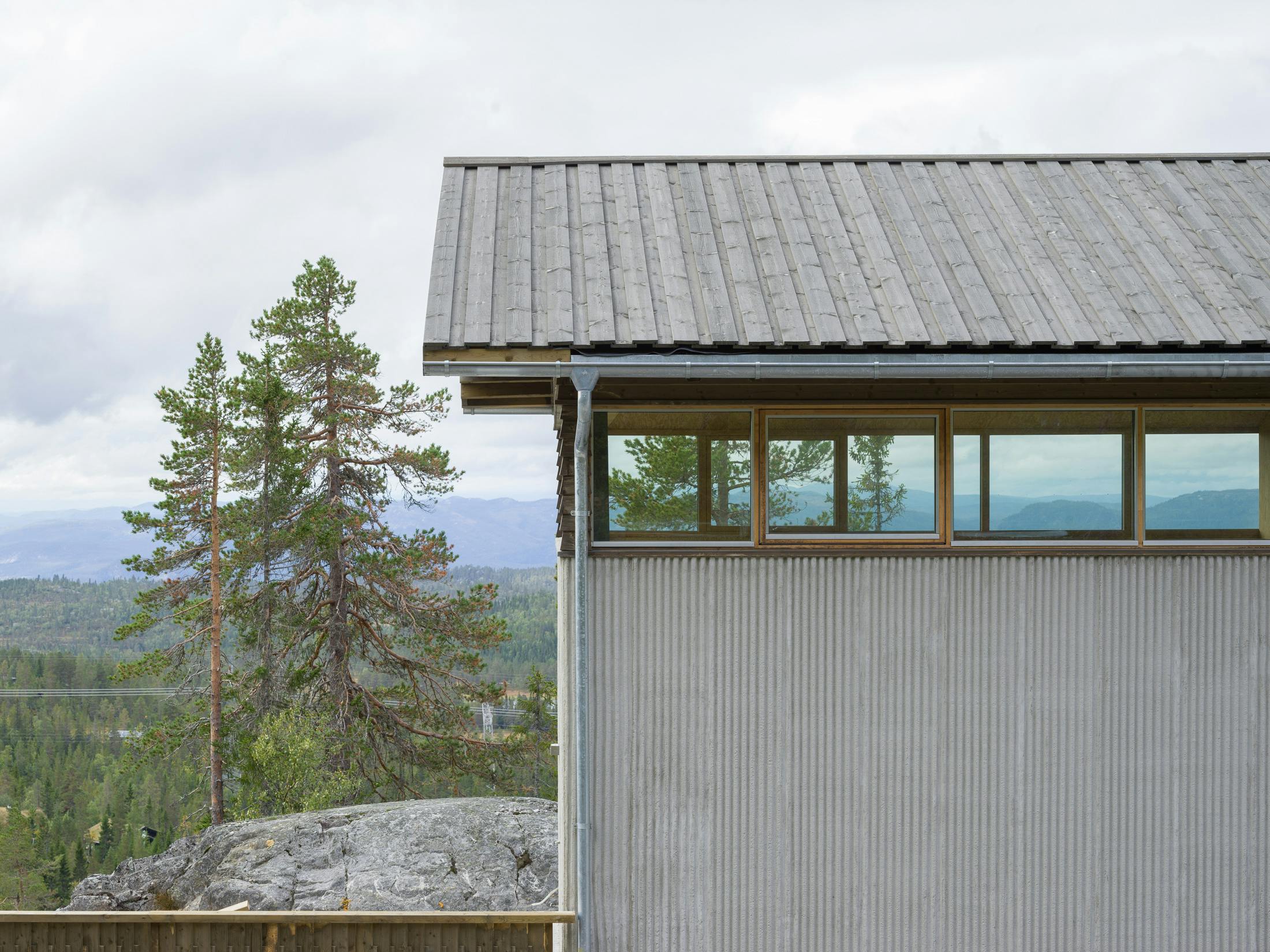 The winter cabin in Norefjell is characterized by a simple and rigid geometry, that meets the rocky mountain terrain of Norefjell, northwest of Oslo. A modest material palette in pinewood planks and plywood, is contrasted by a render with a deep relief, forming a dialog with the surrounding nature of rocks and pine trunks.